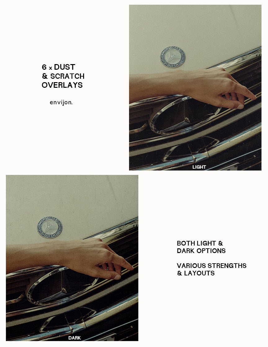 - 6 x Dust and Scratch overlays provided in multiple aspect ratios.